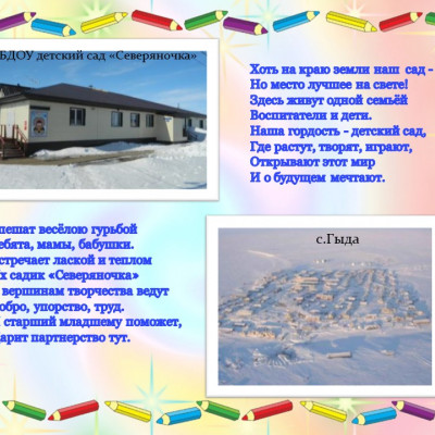 Если Вы активный, творческий музыкальный руководитель, Вы любите путешествия, новые впечатления и достойную оплату труда, приглашаем Вас в детский сад «Северяночка» села Гыда Ямало-Ненецкого автономного округа. Вас ждет теплый, уютный, оборудованный современными средствами обучения детский сад, доброжелательный коллектив.
