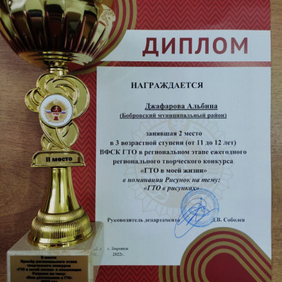 В региональном этапе Альбина Джафарова заняла 2 место в 3 возрастной ступени (11-12 лет) ВФСК ГТО ежегодного регионального творческого конкурса "ГТО в моей жизни" в номинации рисунок на тему: "ГТО в рисунках" и была награждена Дипломом и Кубком. Портфолио воспитанницы было пополнено очередной грамотой.