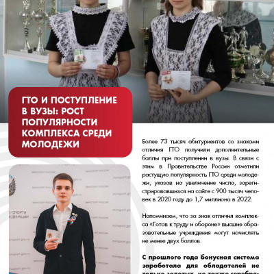 «Знак отличия ГТО не только увеличивает шансы на поступление, но также подтверждает приверженность к регулярным занятиям физической культурой и спортом. В перечень нормативов комплекса ГТО включены лёгкая атлетика, лыжи, плавание, стрельба и туризм – такое разнообразие позволяет вовлечь в регулярную спортивную активность еще больше наших граждан. Как подтверждение, более 20,5 миллионов человек уже вступили в ряды ГТО», - отметил министр спорта России Олег Матыцин.