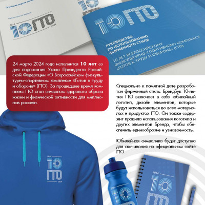 Брендбук 10-летия ГТО включает в себя новый логотип и дизайн элементов, которые будут использоваться во всех материалах и продуктах ГТО. Он также содержит правила использования логотипа и других элементов бренда, чтобы обеспечить единообразие и узнаваемость.
